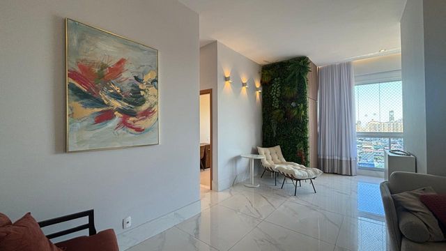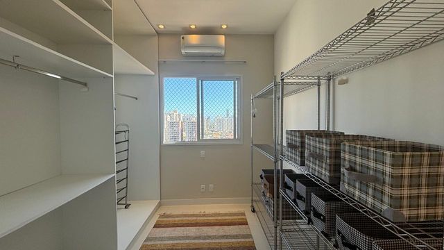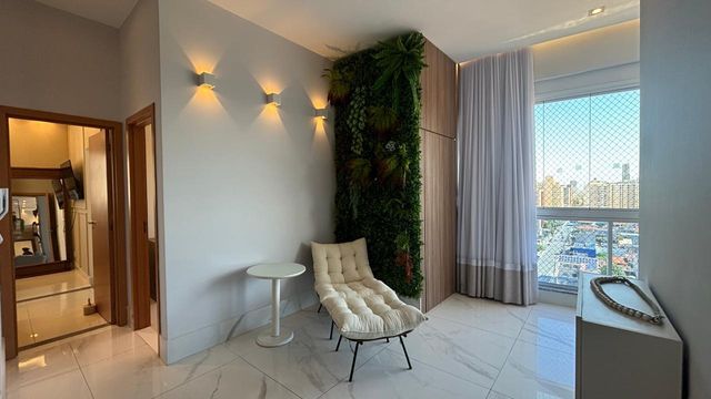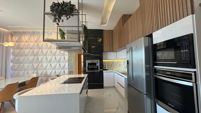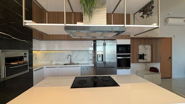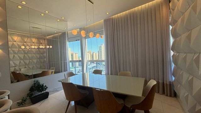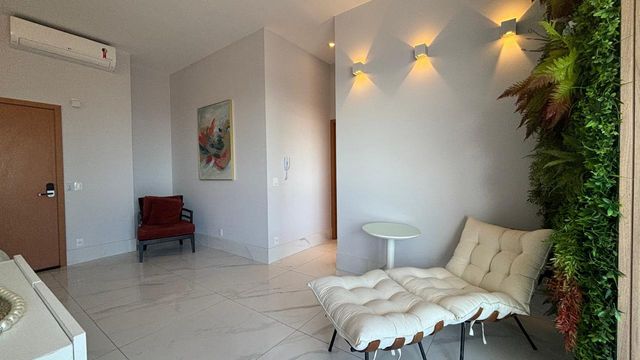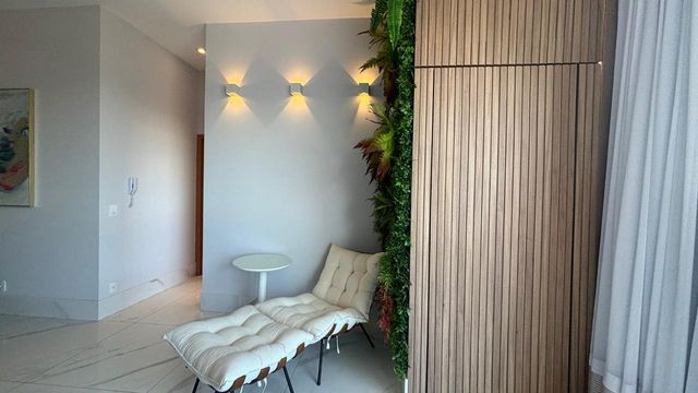A sala ampla e climatizada se integra à varanda, criando um ambiente perfeito para receber amigos e familiares. O projeto de iluminação e a marcenaria fina valorizam cada detalhe do espaço.