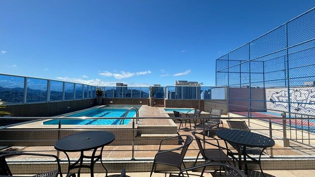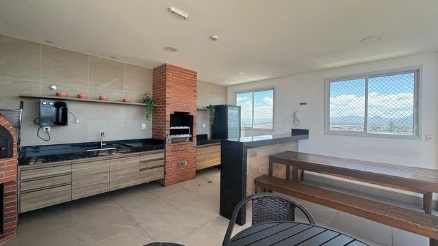 São quatro vagas de garagem cobertas e soltas, portaria 24 horas, sistema de segurança, e lazer completo na cobertura, com piscina, churrasqueira, salão gourmet e vista panorâmica.